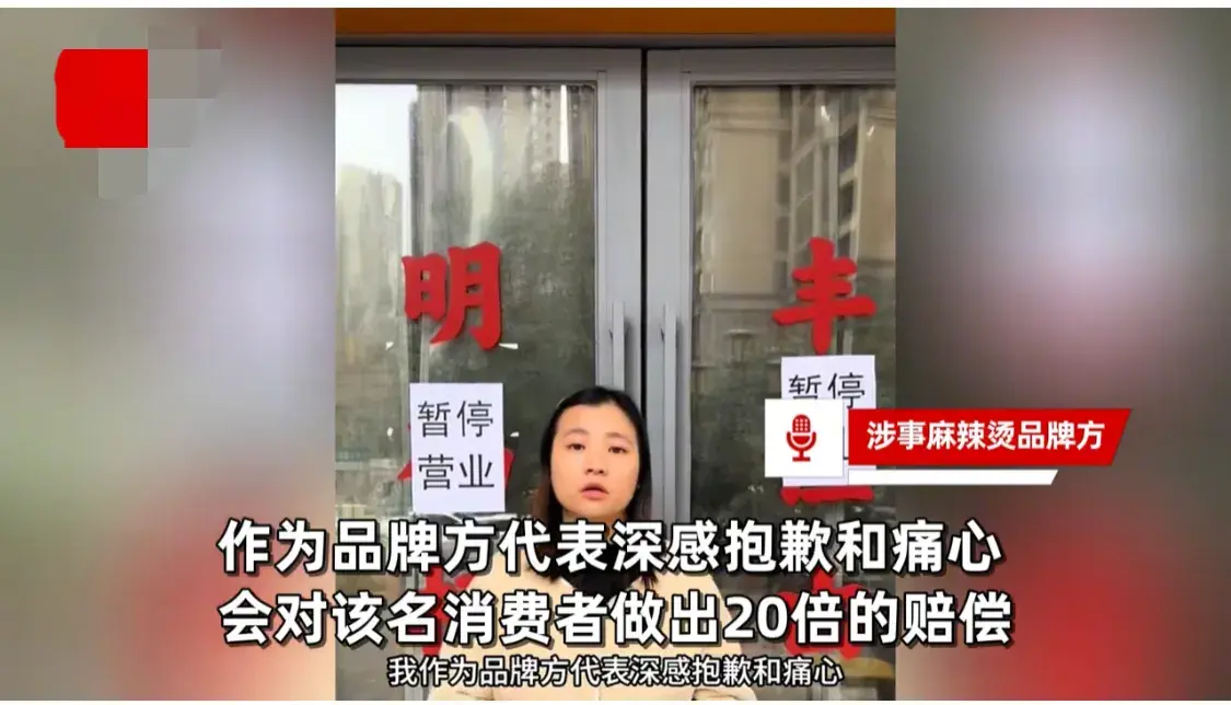随着事件的持续发酵,涉事麻辣烫的品牌方作出回应:品牌方愿意向顾客赔偿20倍的金额,与此同时,品牌方终止了与这家店的合作,目前涉事店已经关门。