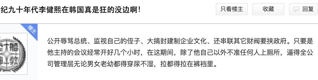 转网友:“公开辱骂总统、监视自己的侄子、大搞封建制企业文化、还串联其它财阀要挟政府。只要是他主持的会议经常开好几个小时,在这期间,除了他自己以外不准任何人上厕所,逼得全公司管理层无论男女老幼都得穿尿不湿,拉都得拉在裤裆里。