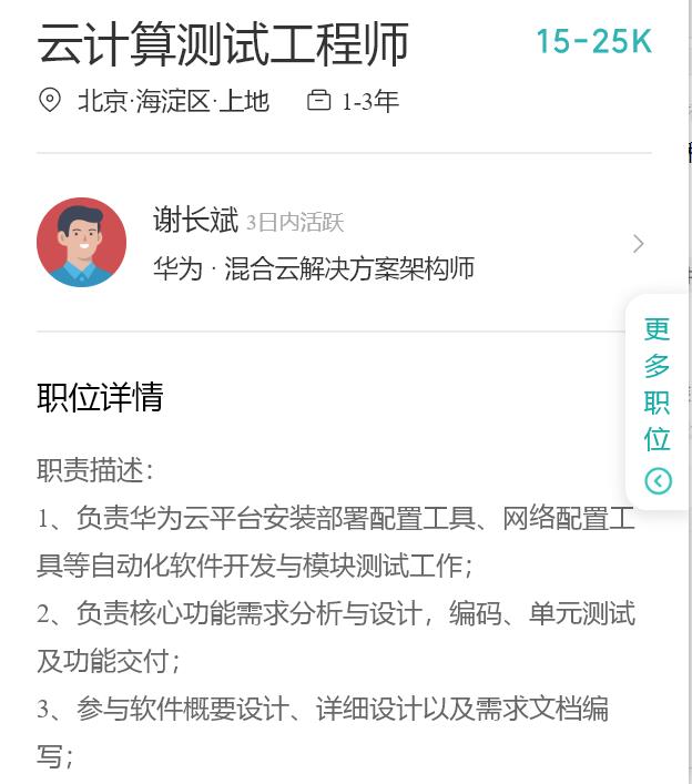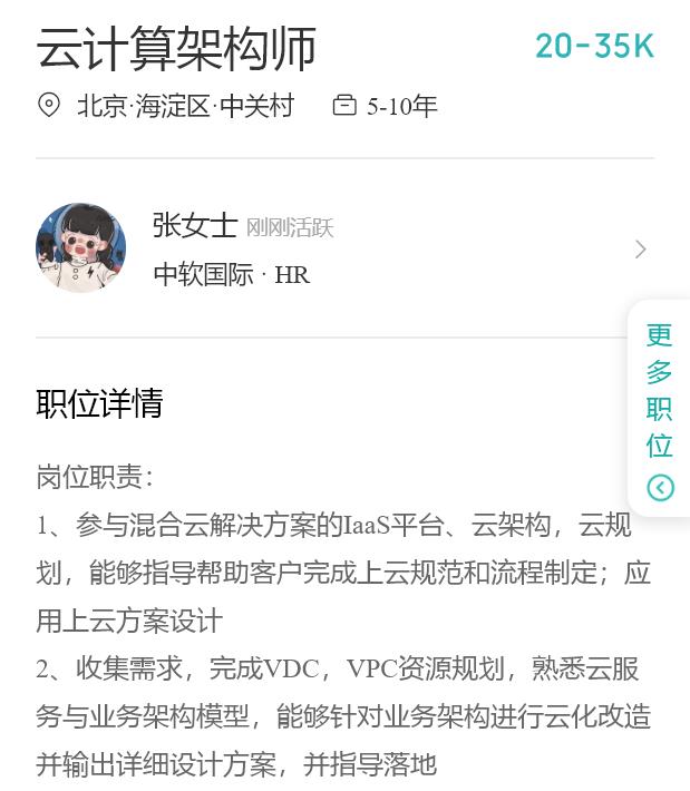 3-5年之后,就可以向云计算架构师、云计算开发工程师方向努力,此时无论是技术能力还是工资水平都会更上一层楼。架构师集开发、测试、运维技能于一身,综合能力非常强,技术方面出了任何问题都有能力解决,可以说是一个总工程师的角色。