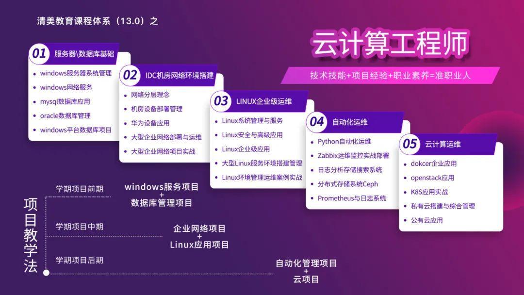 清美云计算课程采用项目教学法,内容涵盖服务器/数据库基地、IDC机房网络环境搭建、Linux企业级运维、自动化运维、云计算运维。