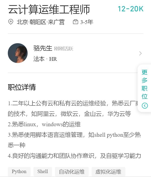 云计算运维岗位是目前需求量相对比较大的岗位之一,随着大量的行业企业纷纷开始采用云计算平台,未来云计算运维的岗位需求量会进一步扩大。云计算运维岗位涉及到虚拟化技术、存储技术、监管和安全等技术,整体的知识面还是相对比较广泛的,而且对于从业者的动手实践能力有比较高的要求。