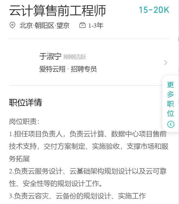 总的来说,云计算领域的销售、开发、运维、管理类人员,都会比传统领域的薪资高20%-50%,又因为这个行业人才供不应求,只要你有相关云计算的知识/经验/技能,都能往这个领域去转,顺应时代发展趋势,让自己的薪资提升一个台阶。
