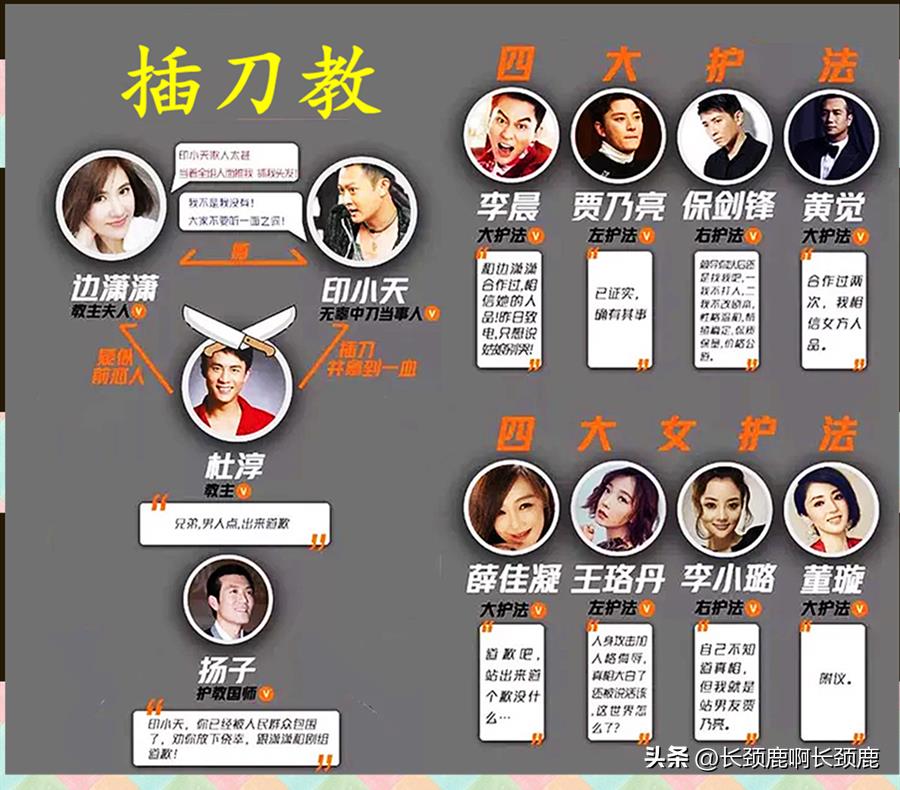 而那些平时与印小天称兄道弟的杜淳,李晨,黄觉等人迅速成立了“插刀教”,薛佳凝,文章,马伊琍,李小璐,王珞丹,保剑锋等人立马加入队伍之中一起公开指责印小天“无品无德”。而边潇潇的另一位同班同学黄圣依的老公杨子更是当起了“正义领袖”,高举道德大旗逼迫印小天道歉。