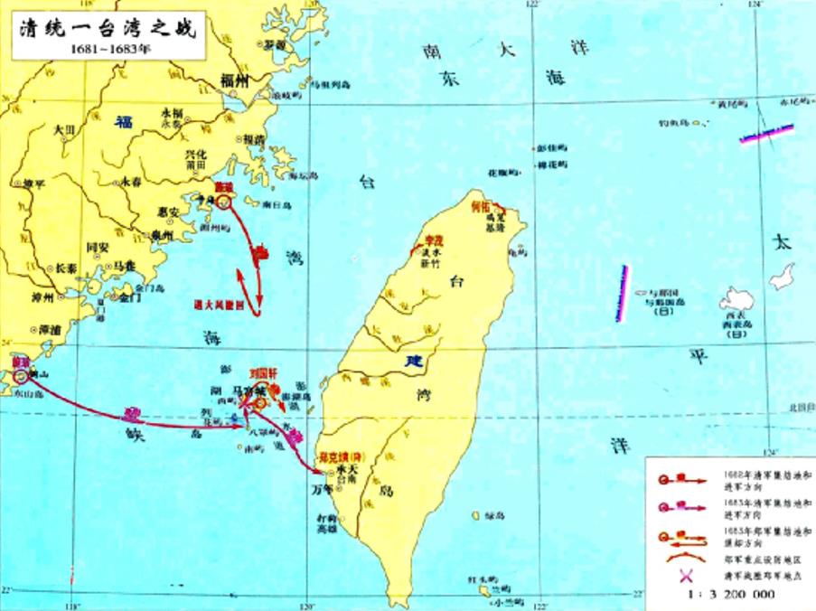 在平定三藩之乱后,收复台湾被提上议事日程。此时,郑成功已经过世多年,台湾大权实际上掌握在冯锡范、刘国轩手里。1683年,康熙以施琅为福建水师提督,出兵攻台,在澎湖大败刘国轩所率领的郑氏海军。随后明郑纳土归降,台湾终于得到统一。1684年,清政府在台湾设立一府三县治理,隶属于福建省,加强对台湾的管辖。
