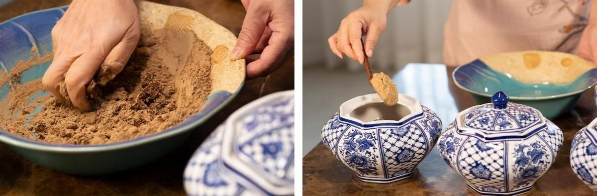莞香的制作是一门复杂而精湛的工艺,需要经年累月的学习和实践。这个过程涵盖了对原生态莞香树的培植获取和加工取精两大部分,从移植、折枝、断根、开香门、育香到采香、理香、拣香、窨香、合香,工序多达30道,时间跨度十余年甚至几十年。