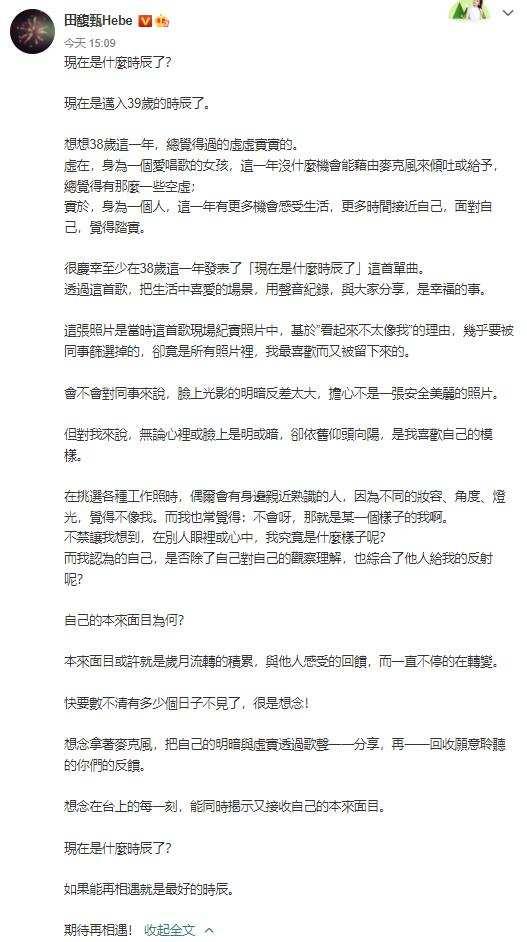 Hebe没有步入婚姻,但在39岁的年龄里对自己也有不一样的体验。过完生日后,就在个人社交账号上晒出小作文,很庆幸在38岁能依旧用歌曲跟大家分享自己的日常。相比私生活,大家看到的田馥甄都是为自己的歌手梦不断坚持着。
