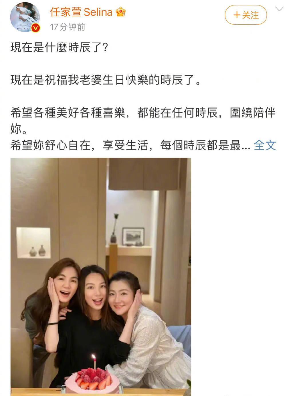 这次三姐妹合体为的就是给Hebe田馥甄庆祝生日,Selina在个人社交平台上晒出组合三人一起为田馥甄庆祝生日的照片,还热切地称呼Hebe为“老婆”,关系超好。
