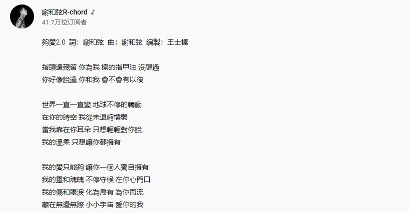 歌曲还有一版是东城卫和谢和弦的版本,而前不久谢和弦更是推出了够爱2.0版,在油管引发了一波回忆杀。本来是一件令老歌迷们很怀旧的好事,可不想还是陷入了版权之争,够爱2.0版本词曲标注谢和弦,熟悉这首歌的人都知道是陈德修的曲。有人侵权自然有人要出来维权,陈德修先表示谢和弦侵权,但愿意商讨授权事宜,而谢和弦则说作曲是自己,争论越演越烈,甚至还出现了‘承诺并保证将本著作之全世界地区之全部著作财产权永久转让予OP’的说法。