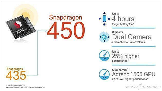 在大家关心的GPU方面,骁龙450集成了Adreno 506 GPU。看着很熟悉?没错,骁龙625集成的也是这颗GPU,结合整体参数来看,我们可以将骁龙450理解为降频版的骁龙625。