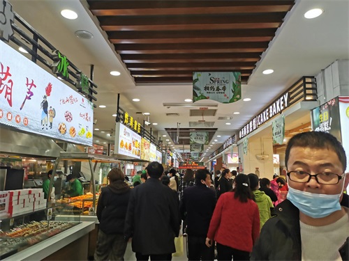 这是1楼一进去都是卖吃的的,各种品牌的吃食蛋糕,烤串、披萨饼、糖葫芦。往里走里边是超市,各种吃的,方便面、水产、熟食,调料、 各种干货、干鲜果、蔬菜、水果、点心等各种商品。