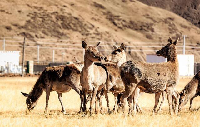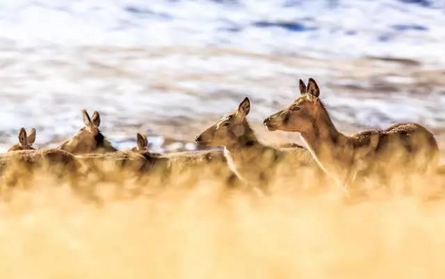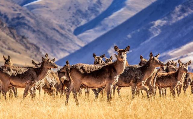 鹿群远远地站着,眼睛直视前方,耳朵竖立着,似乎是在猜测不速之客的来意。鹿群背后是连绵起伏的山丘。在这里人与自然真正的做到了和谐相处。
