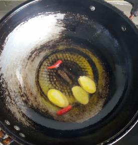 做法:1.锅中放入油,下生姜、辣椒爆香,把鱼倒进去煎