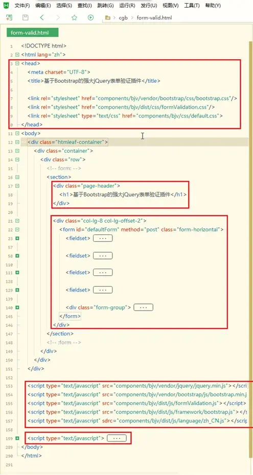 要用第三方的框架Bootstrap+jQuery的验证框架,使用第三方定义的样式。几行代码,二三十行代码我们都已经不陌生,基本已经能掌握,可如何去加入第三方的代码,引用它定义的一些资源呢?如css和js。如何去写近290行代码的网页呢?