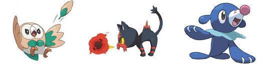 发布的信息中公布了初学者用的PM,俗称御三家。分别是草系的猫头鹰(Rowlet)、火系的火猫(Litten)与水系的海狮(Popplio)。