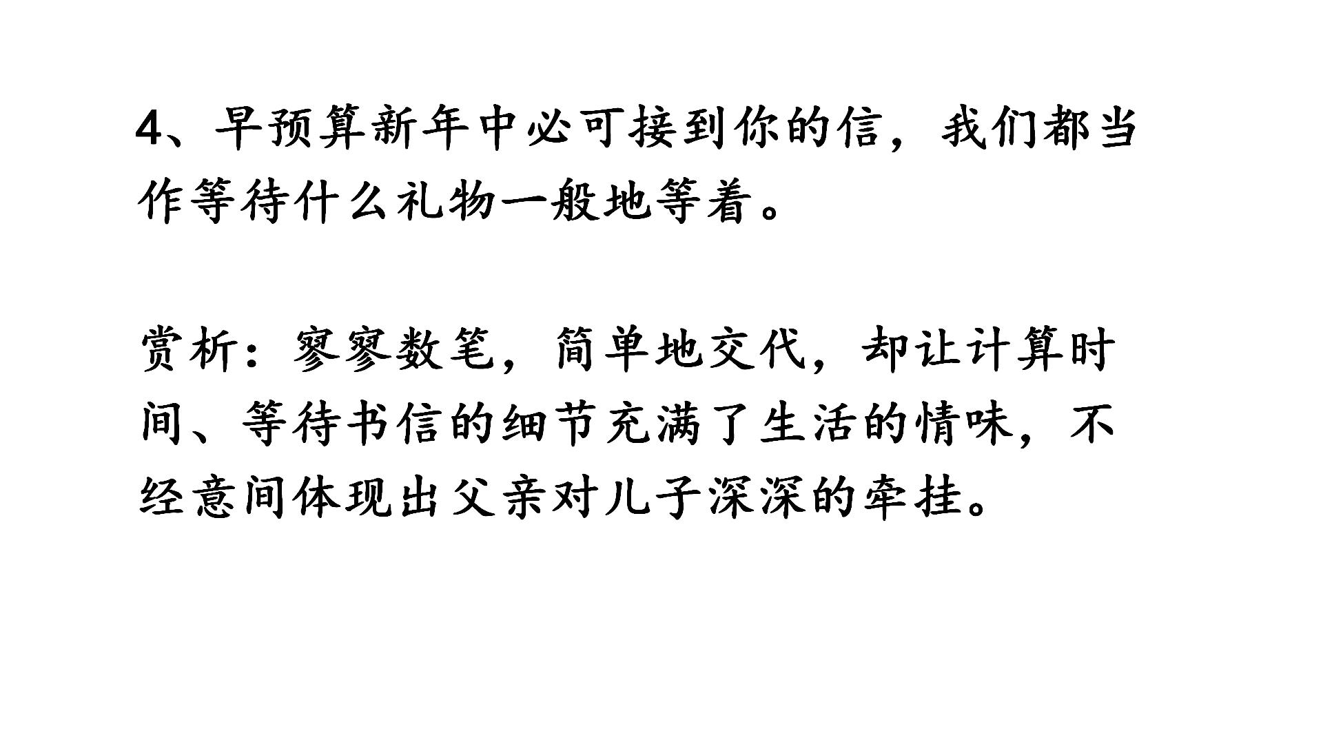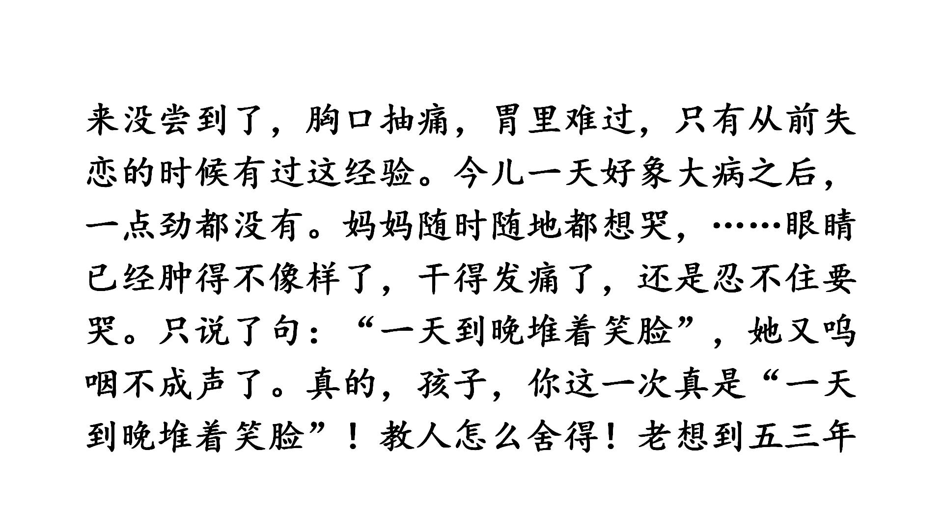 原文:你走后第二天,就想写信,怕你嫌烦,也就罢了。可是没一天不想着你,每天清早六七点就醒,翻来覆去睡不着,也说不出为什么。好像克利斯朵夫的母亲独自守在家里,想起孩子童年一幕幕的形象一样;我和你妈妈老是想着你二三岁到六七岁间的小故事。