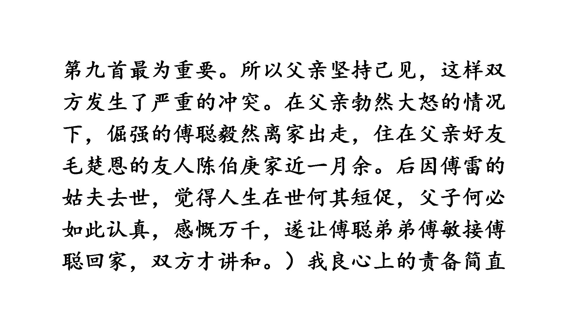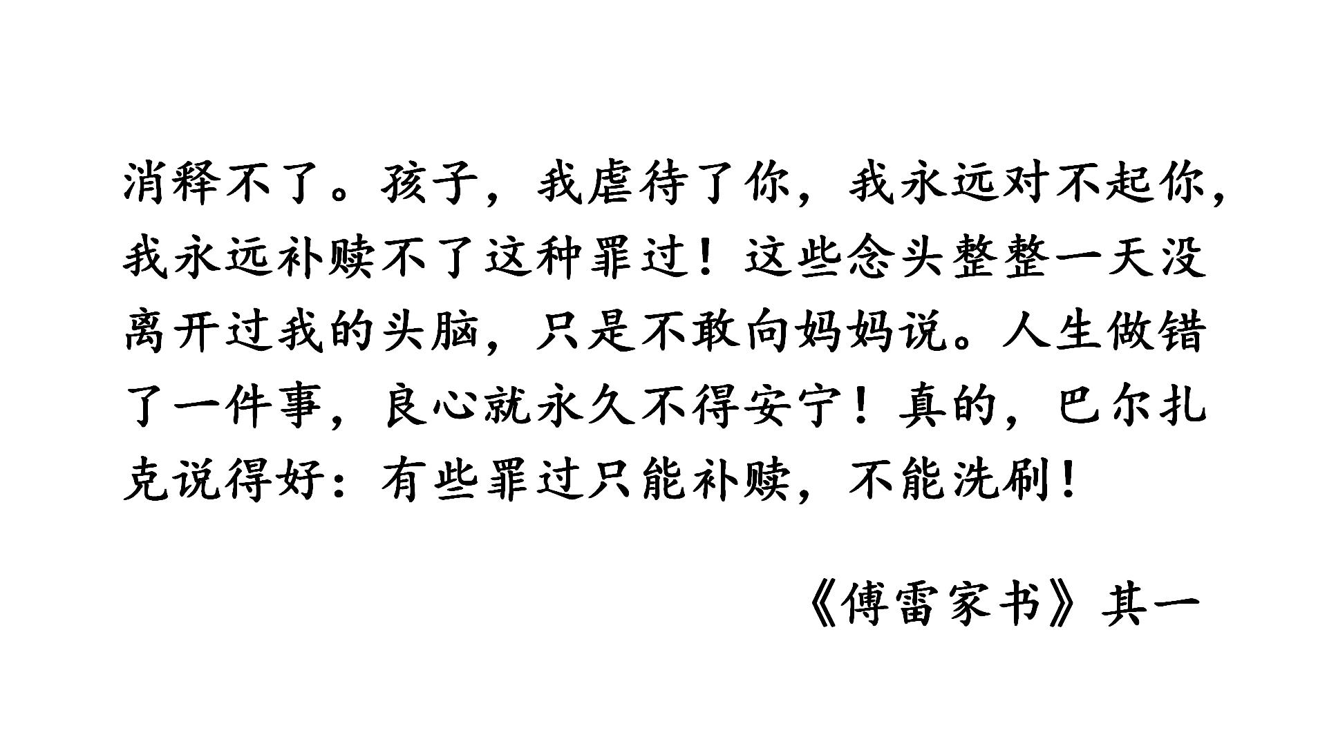 严父的自责一一在傅聪年幼时,傅雷对他严加管教、一丝不苟。回忆起往事,傅雷开始后悔和自责,觉得对儿子的管教过于严格,手段过于“残忍”。傅雷在信中写道:“孩子,我虐待了你,我永远对不起你,我永远补赎不了这种罪过!”他把对儿子的管教当成自己的错误,甚至是“罪过”。