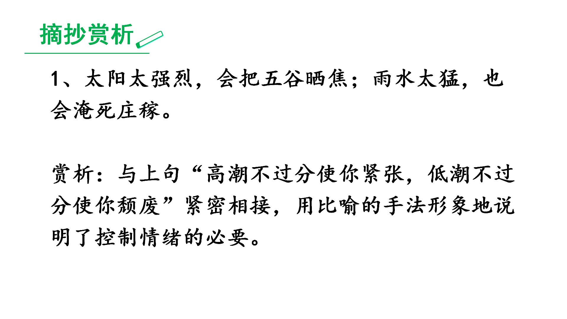 4.“人一辈子都在高潮──低潮中浮沉,惟有庸碌的人,生活才如死水一般;或者要有极高的修养,方能廓然无累,真正的解脱”这句话的意思是什么?说说你的理解。