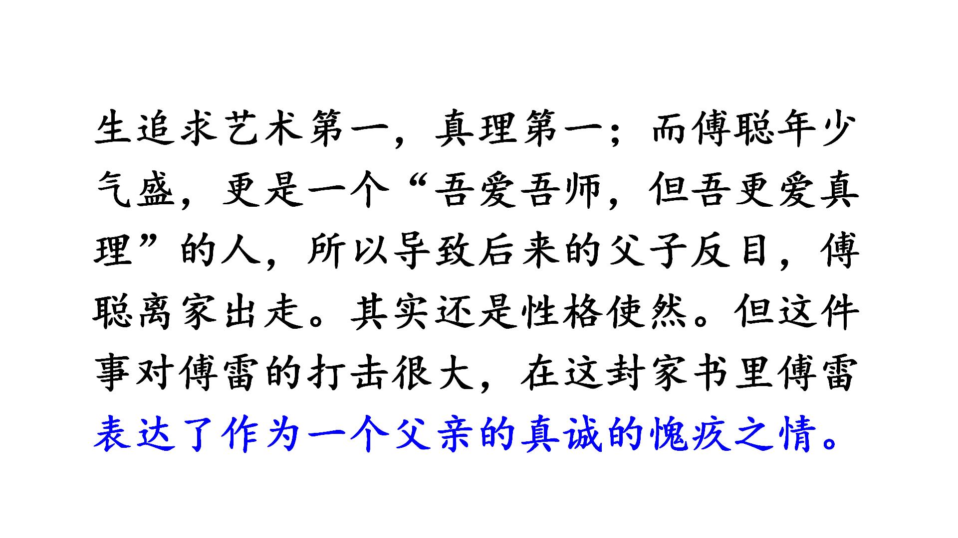 父爱浓浓一一在傅聪走后第二天,傅雷就想给他写信,但是担心被“嫌烦”。儿子离开后,他每天睡不着觉,开始回忆傅聪小时候的事。傅雷夫妇含辛茹苦地将儿子哺育成人,如今儿子离开父母远赴海外求学,傅雷既希望他学有所成,又深深地想念他。浓浓的父爱,跃然纸上。