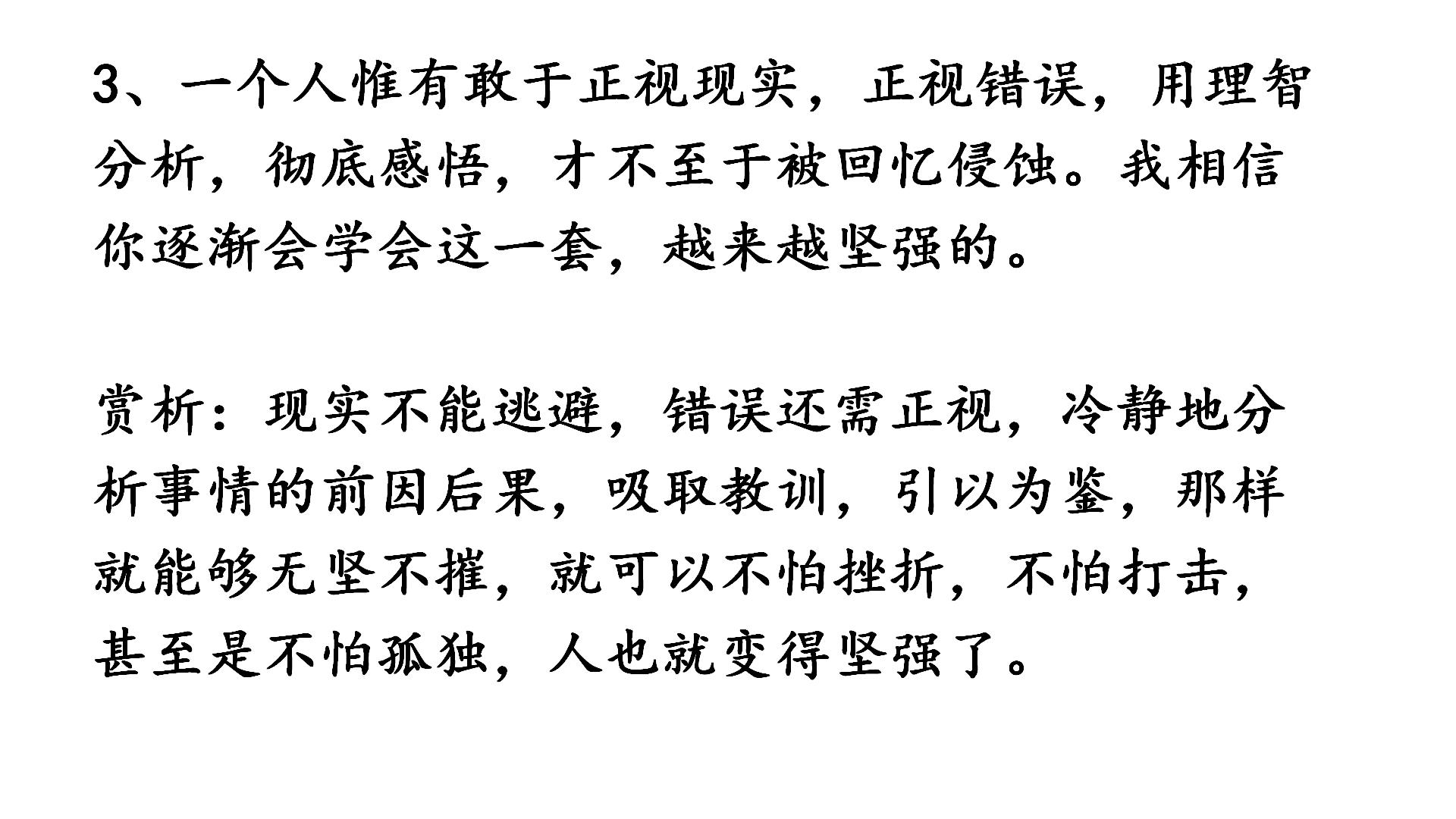 12.傅雷告诉儿子,想着过去的艰难,让你以后遇到困难时更有勇气去克服,不至于失掉信心!人生本是(没穷尽没终点的马拉松赛跑)。