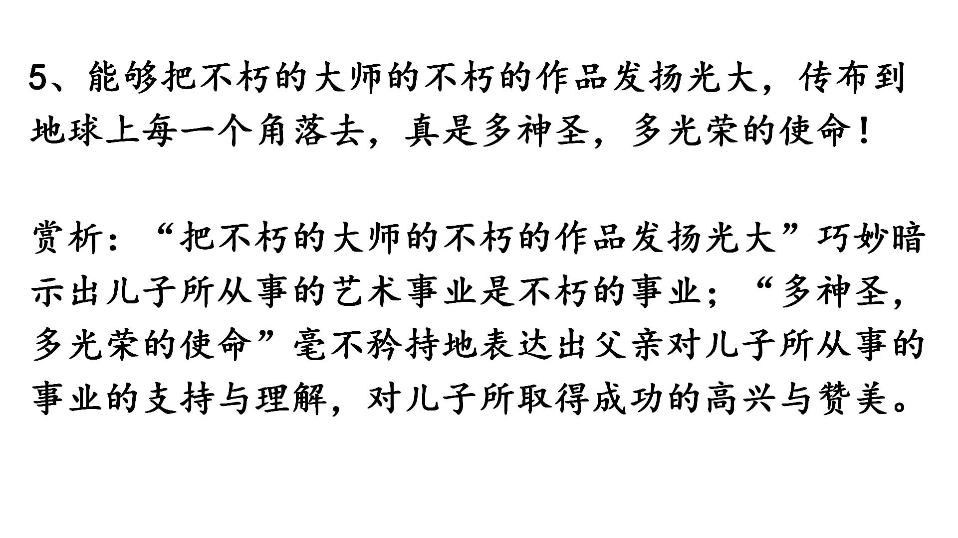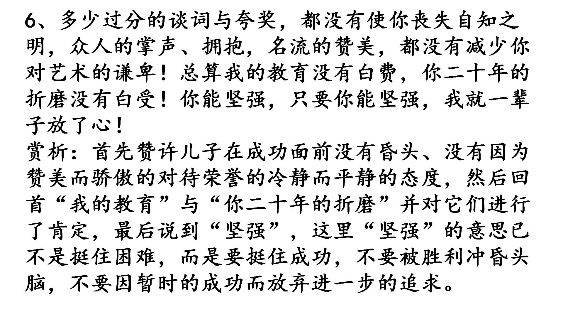 感悟:这是傅雷听过儿子傅聪的钢琴演奏录音后对儿子的讲评。这里面包含了傅雷对儿子的钢琴演奏录音的精细的分析及赞赏,并且在后面提到了对儿子的希望。这是家长对孩子的正确的教育方法,即既要体现出自己对孩子的肯定,让其有努力拼搏的决心以及会成功的信心,也要提出自己的希望,给孩子指明前进的路线、发展的方向。而我们当子女的,也应在父母的引导下,吸取父母的经验,取长补短地发展自己。