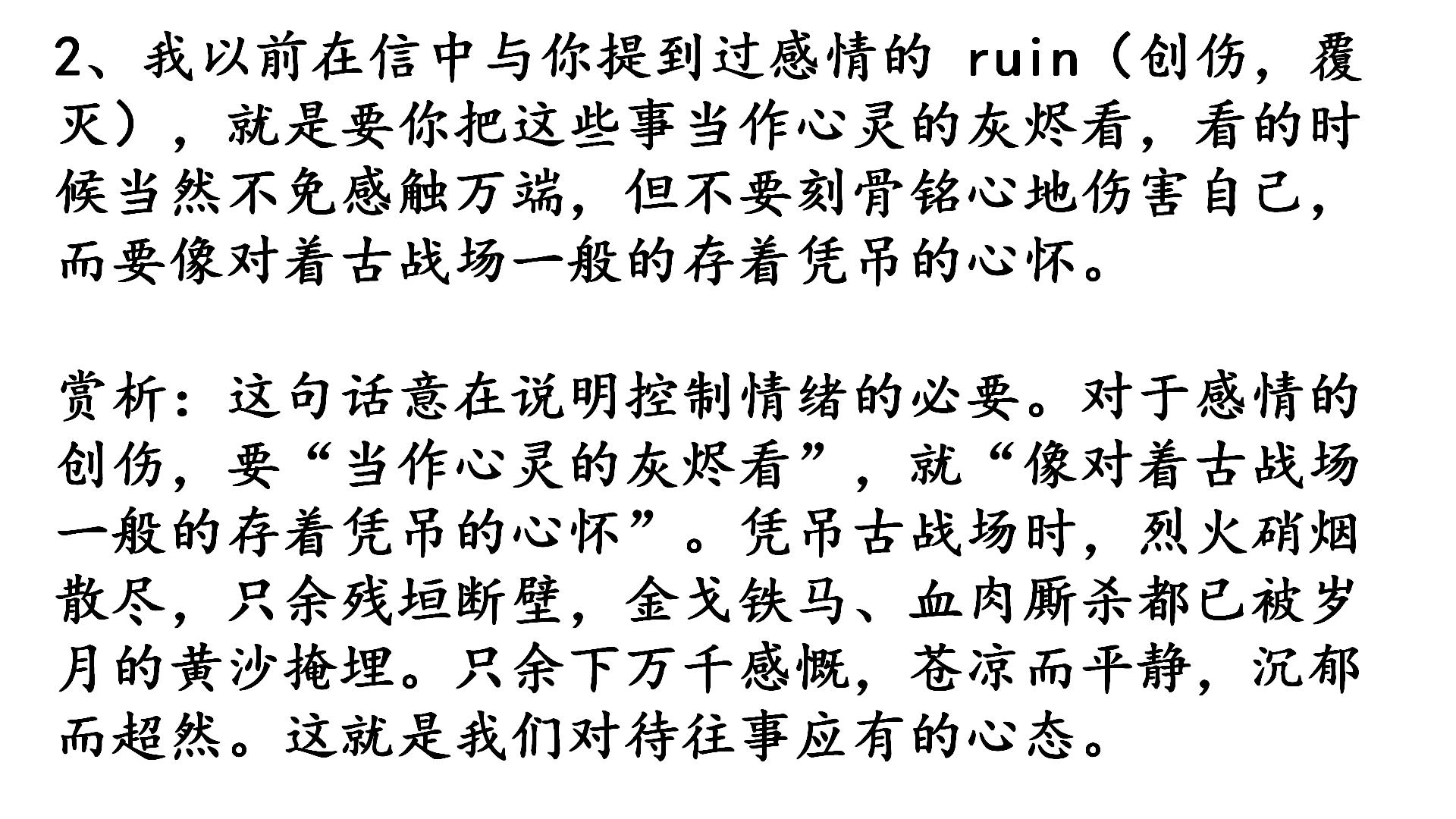 是在儿子受到打击意志消沉时写的,劝慰儿子面对感情创伤要学会泰然处之。作者在信中告诫儿子“这种精神消沉的情形,以后还会有的”。