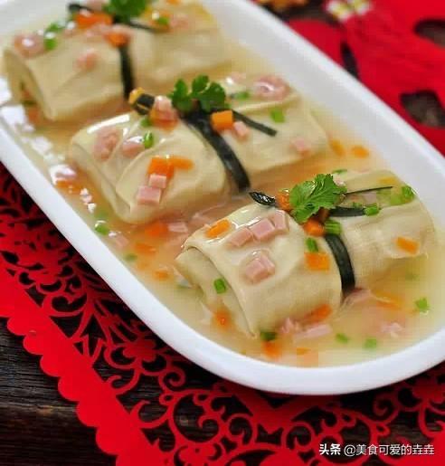 原料:鸡肉 100 克、虾仁 100 克、猪腿肉 100 克、豆腐皮两张 配料:竹笋一个、香菇四朵、胡萝卜三分之一根、葱一段、姜一块、蛋清一个。 调料:鸡汤半碗、盐一茶匙、胡椒粉一茶匙、葱油半汤匙、蚝油一汤匙、老抽四分之一汤匙。