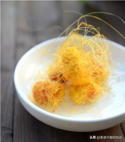 20.蛋黄上铺一层年糕。