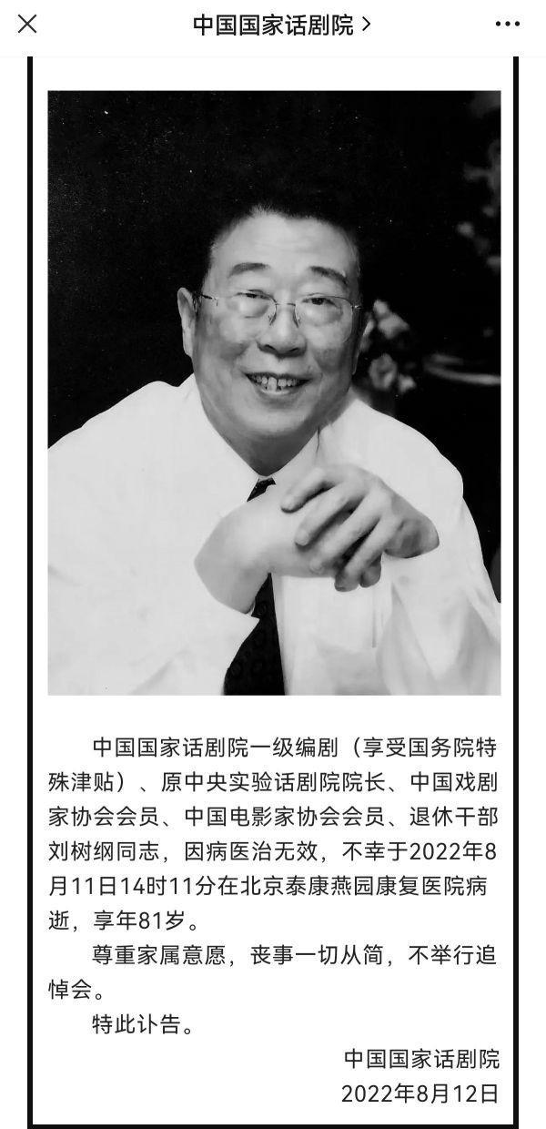 2022年8月11日刘树纲在北京病逝,享年81岁。