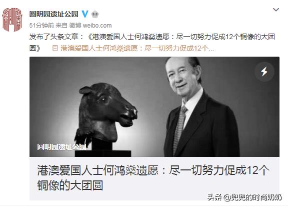 2019年11月,何鸿燊决定将圆明园马首铜像捐赠给国家文物局,为其百年回归之路画上圆满句号。