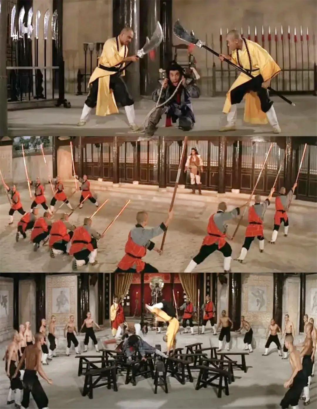 “板凳阵”利用板凳可以拦、压、架、扣、撩、绞、挑、扫、撞、击,势不可挡,拍的天花乱坠,神乎其技,是不是想到了《方世玉2》中方世玉救母那段板凳大战,看来他们的创意都来自《三闯少林》。