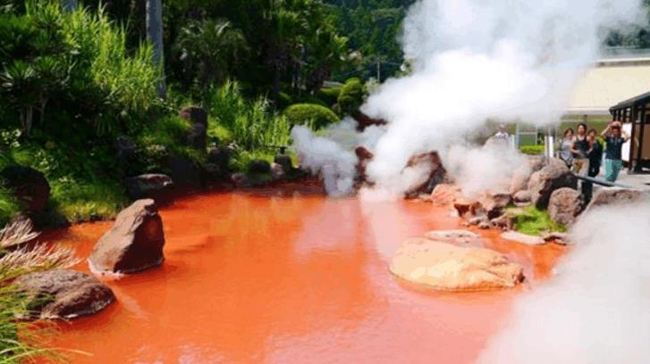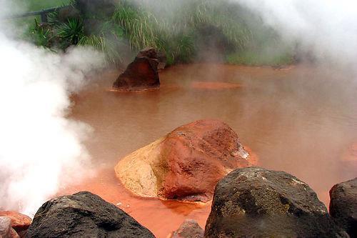 它富含酸化铁,好似一池翻滚的血浆,夹杂着巨大的轰鸣声,被日本佛教徒认为是来自幽冥地狱中的激流。利用血池地狱的温泉红粘土制成的血池软膏可以治疗脚气,在日本很受欢迎。