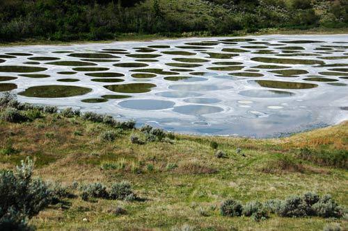 斑点湖位于加拿大,在夏季炙热的太阳光下,湖水蒸发结晶出了很多矿物质,最后形成许多白色镶边界线和浅池,浅池中的水也因富含矿物质而呈现出蓝色或者绿色等奇特的颜色,远远望去,湖水就像是一块块的斑点,斑点湖也因此而得名。