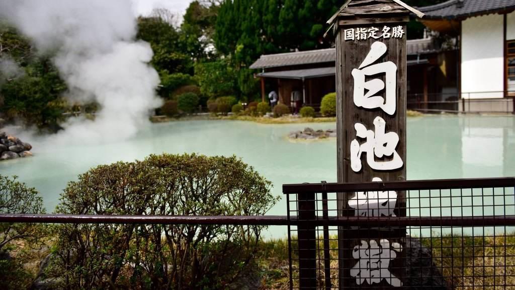 白池地狱,是日本国家指定名胜之一。从池子里喷出的虽然是无色透明的热水,但是在重新落回池子的时候,却由于温度和压力的低下,池子的表面呈现青白色。