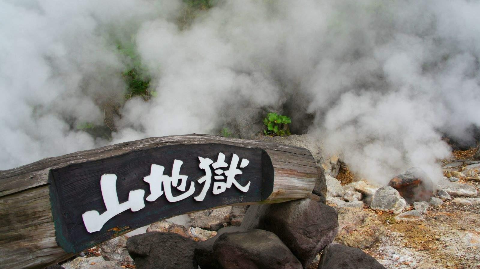 山地狱,喷气在群山中徐徐升起,所以称之为"山地狱"。泉温大约90度。利用温泉的温度,栽培世界各国珍贵的植物。