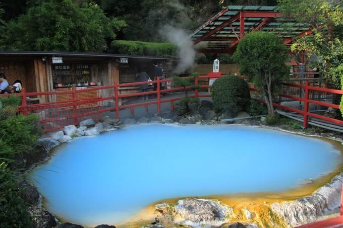 温泉水呈蓝色,有袅袅升起的热气和朱红色的栏杆,池水在一天中会不停的变幻颜色。真想就一直坐在池边静静的看着它变化。