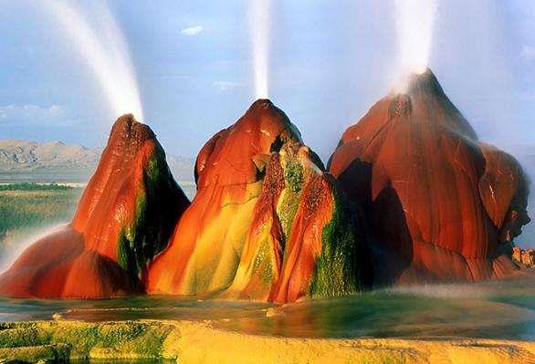 飞翔间歇泉坐落在美国的内华达州,其因鲜艳夺目的色彩而闻名。飞翔间歇泉并非天然形成,而是在1916年人工开采出钻井后形成的,由于间歇泉喷射的水中含有大量的矿物质和细菌,因此才形成了如此夺目的色彩。