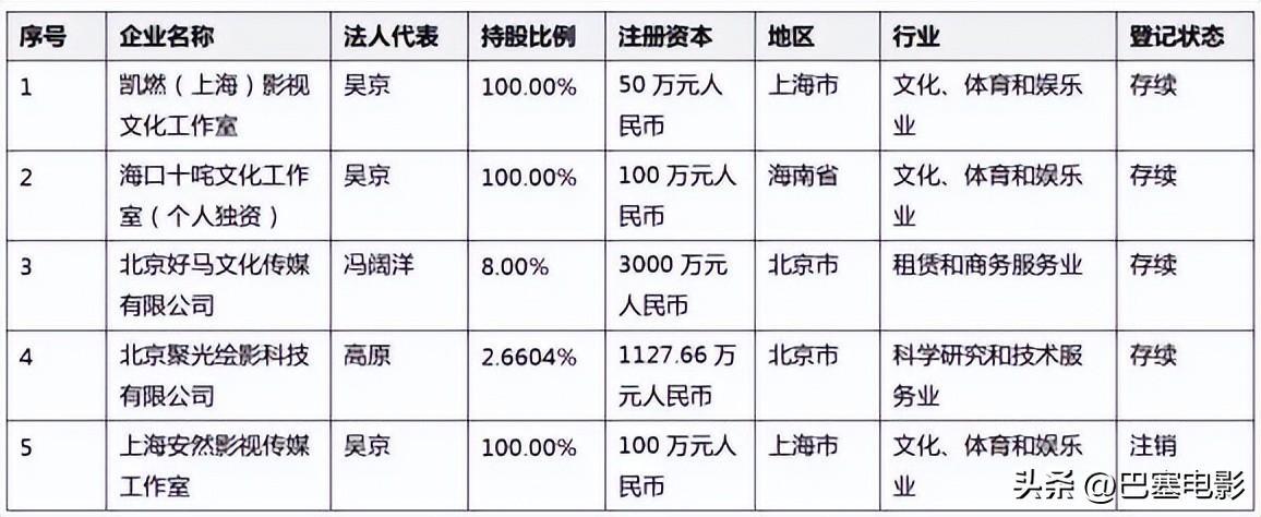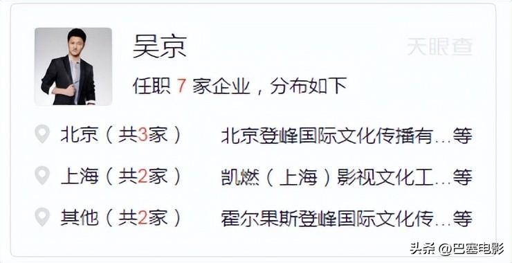 除了拍电影、代言,吴京也很喜欢投资,据天眼查显示,他名下一共有7家公司,其中有两家属于对外投资。