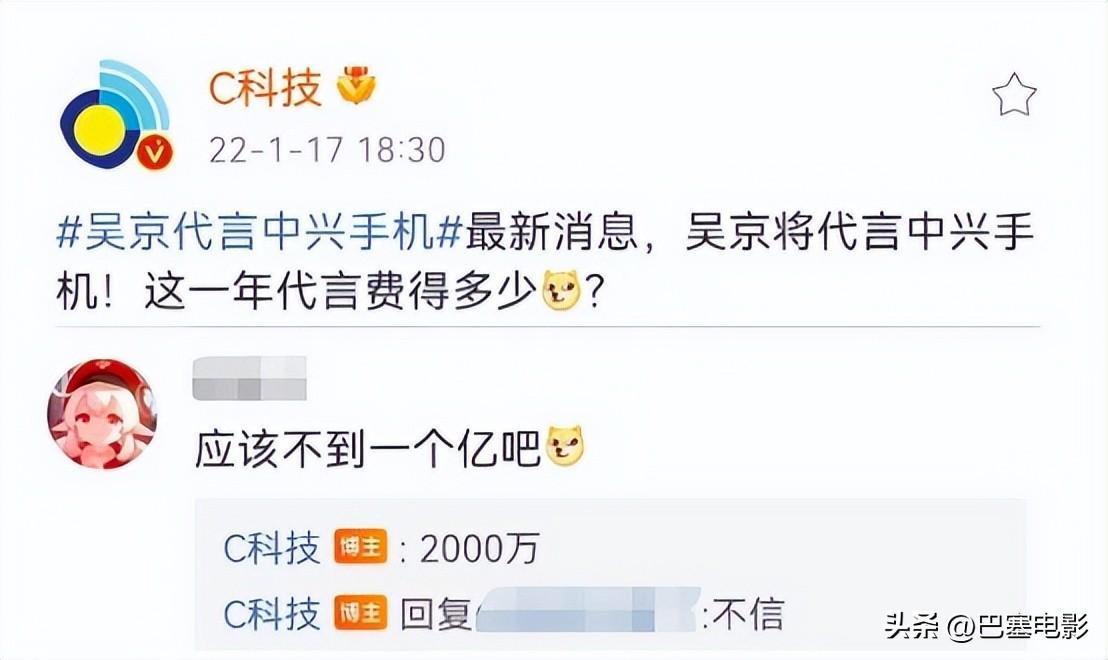 而有的代言费甚至更高, 譬如有大V爆料中兴就2000万每年,这样算下来,吴京光代言费也能挣到两三亿了。