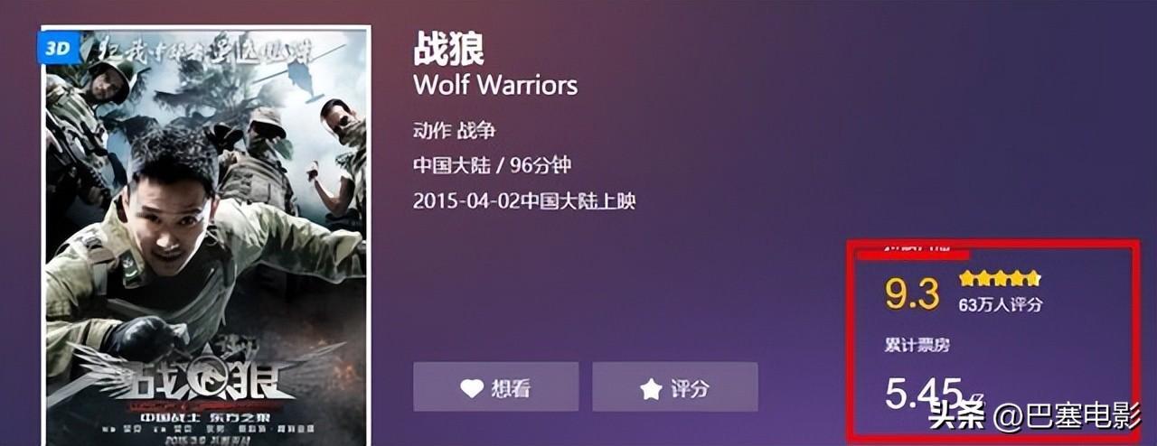 2015年,《战狼》开始在全国各地热映。凭借着过硬的质量和口碑,在上映首日,《战狼》就收获了4000万票房,最终票房成绩高达5.4亿。