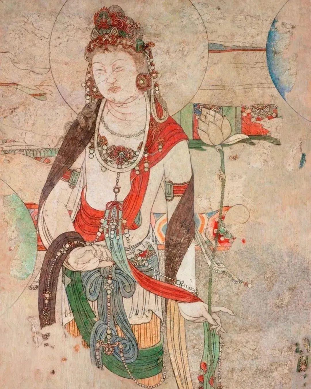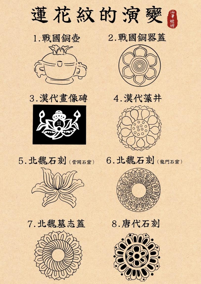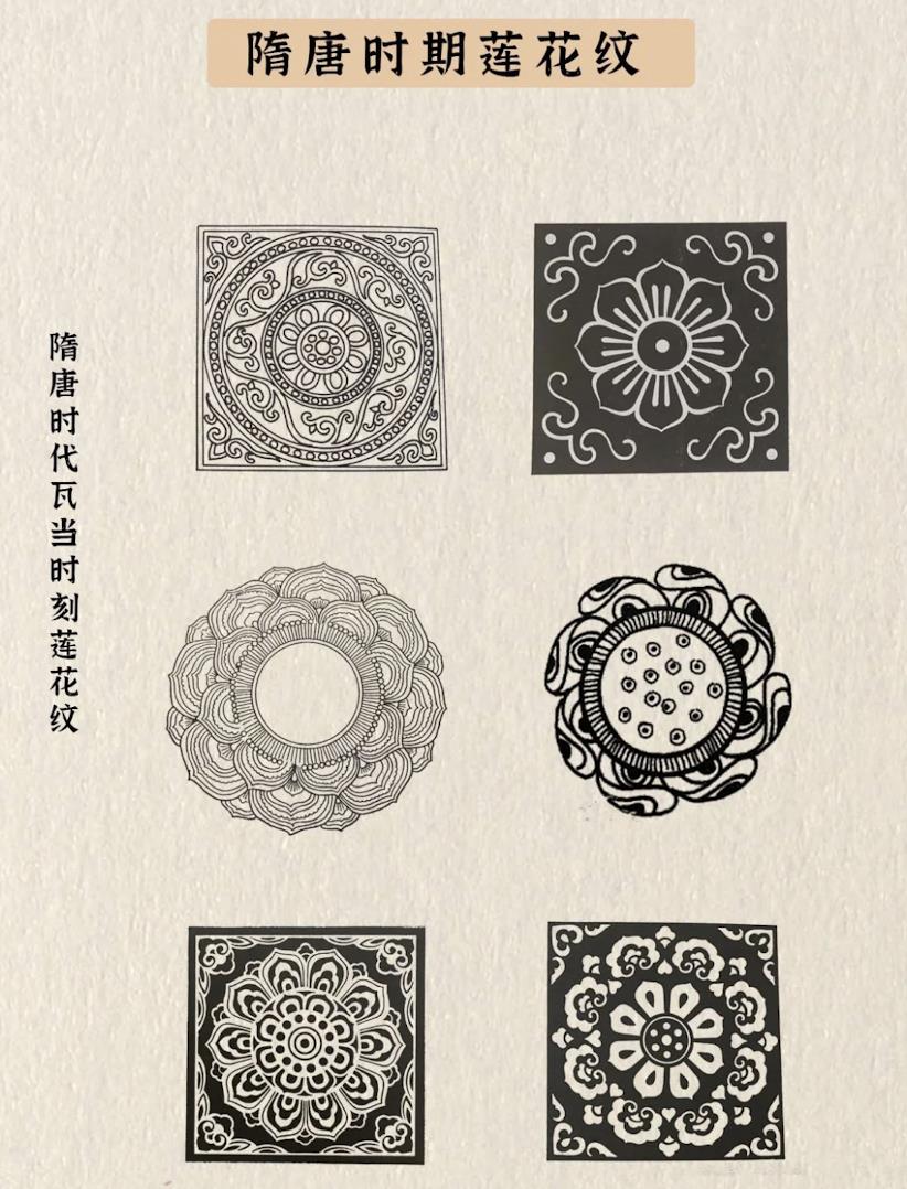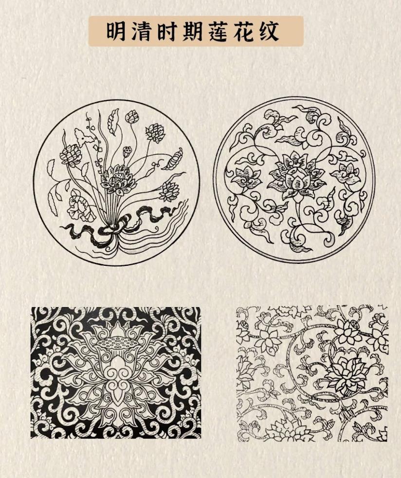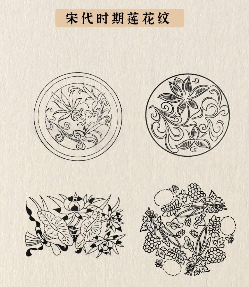 我国将莲花作为装饰题材大约始于西周时期,莲花纹的运用主要用体现在青铜器上。在汉代,因莲花生于水中的习性而被人们认为具有“辟火”的功效,装饰上常常可以见到莲花纹。南北朝时期因佛教盛行,莲花纹被广泛运用到石刻、陶瓷、铜镜、服饰、彩绘和壁画等领域。南北朝至唐代,莲花纹常作为主题纹饰,尤其见于服饰装饰上。