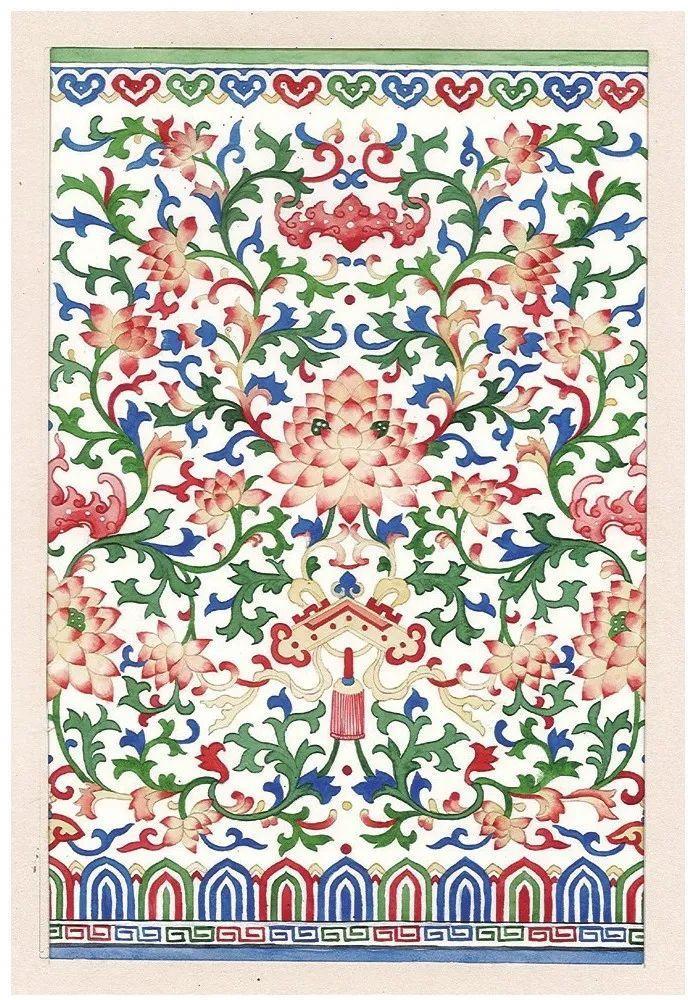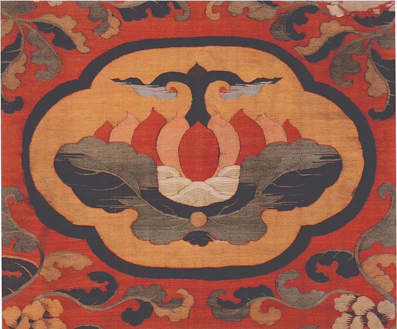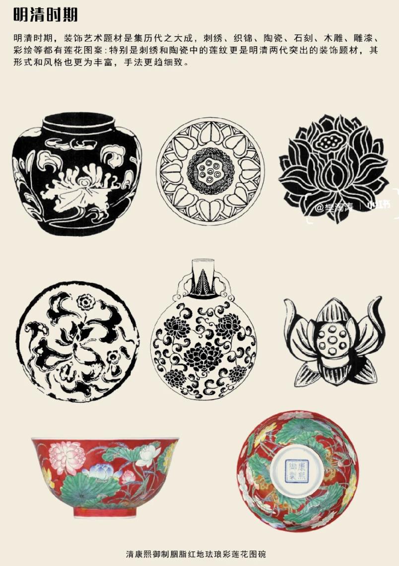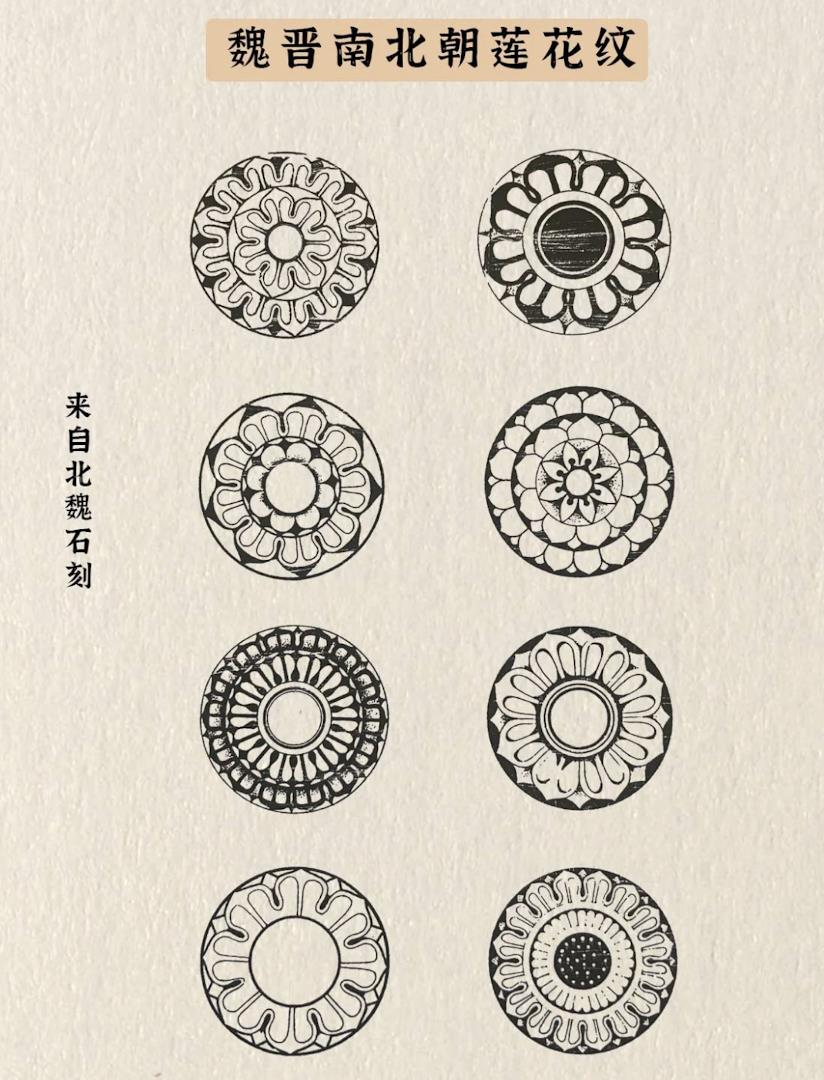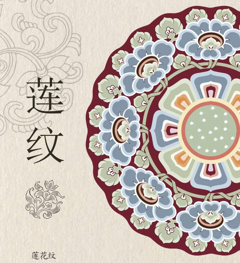 用于:我国将莲花作为装饰题材大约始于西周时期,莲花纹的运用主要用体现在青铜器上。在汉代,因莲花生于水中的习性而被人们认为具有“辟火”的功效,装饰上常常可以见到莲花纹。南北朝时期因佛教盛行,莲花纹被广泛运用到石刻、陶瓷、铜镜、服饰、彩绘和壁画等领域。南北朝至唐代,莲花纹常作为主题纹饰,尤其见于服饰装饰上。