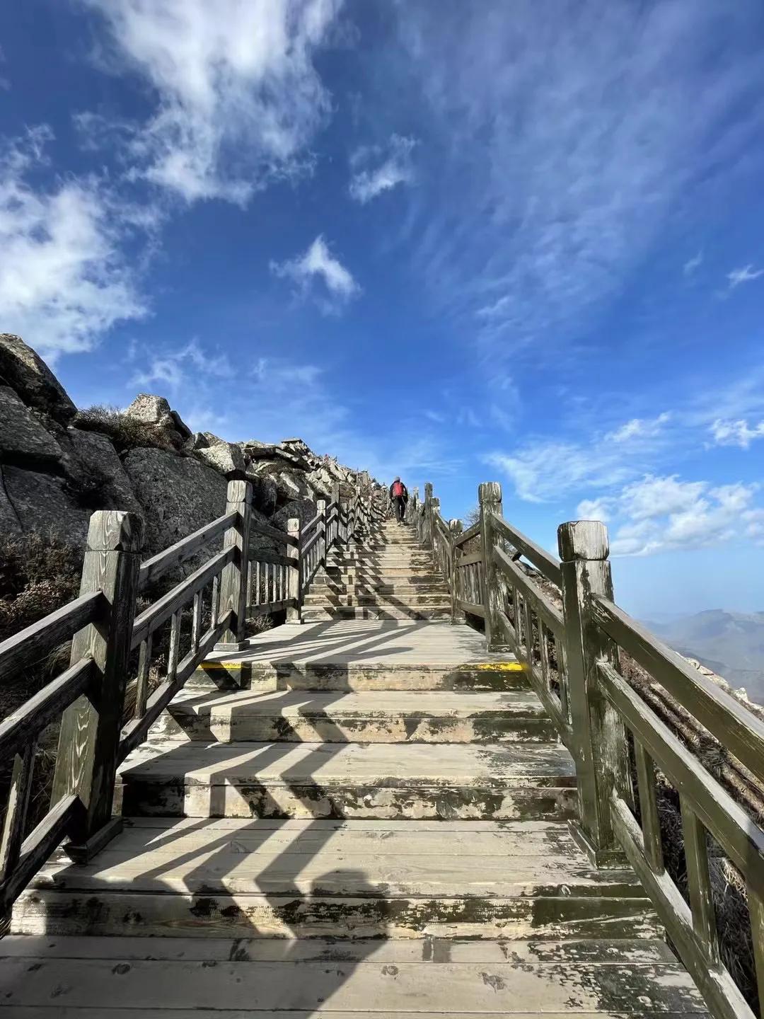 过了小文公全程上坡,走不完的木楼梯,最后终于看到缆车了,工作人员看见我们大声问:“有缆车票吗?”我们一边疾走一边挥着手一边大喊: “等等我!有票!有票!”终于坐上缆车,看见有工作人员已经在卸缆车轿厢了,万幸万幸,我们赶上了最后一班缆车。环顾四周,只见苍茫群山,丝丝白云;回首望去,那些走过的路,看过的景,渐渐远去,却在我的记忆深处不断显现,深深印刻。