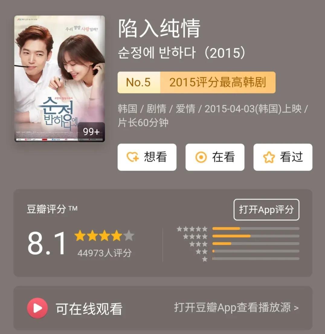 结果《陷入纯情》收视率开播破1,始终保持稳定,在豆瓣也有4万多人打分,以8.1的优秀分数进入2015年评分最高韩剧榜单。
