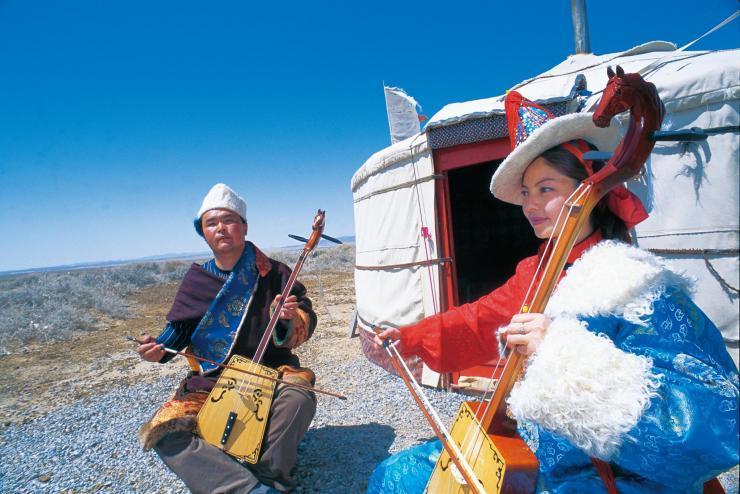 历史上蒙古族曾经统治青海很久。从蒙古高原下来的蒙古游牧民族给青海这块土地打下了深深的烙印。这从许多山名、湖名、地名中就可以看出,蒙古族也是青海境内的主要少数民族之一。这张照片拍摄于柴达木盆地北缘德令哈市附近的克鲁克湖边。住蒙古包,拉马头琴,蒙古文化显现出了与汉、藏文化鲜明不同的一面。摄影/孙建军