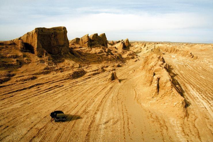 近些年来,雅丹作为一种景观进入了人们的视野,人们开始把雅丹当作一种美景欣赏。在青海的柴达木盆地,有着中国规模最大的雅丹群。在柴达木的西北角拍下的这张照片,让我们看到了柴达木盆地中雅丹地貌的风采。倾斜的地层,在风的剥蚀下,形成了独特的单面山,断崖下则是风道,风吹出的一道道线条像一条条高速路一样消失在远方。一辆越野车开进了这寂静无人的世界,车辙好像是一个问号,在问,为什么这里的一切如此神秘和奇特。摄影/单之蔷