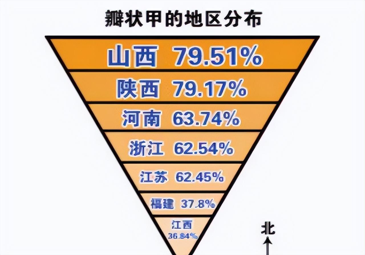 但是人类学家在后来的调查过程中却发现,瓣状甲与山西人有着密切的关系,经过了近百年的走访和调查,发现瓣状甲人群在山西的分布最为广泛,几率高达80%,以山西为中心,这种瓣状甲的人群呈分散趋势,距离山西越远的地区瓣状甲的人群分布率就越低。
