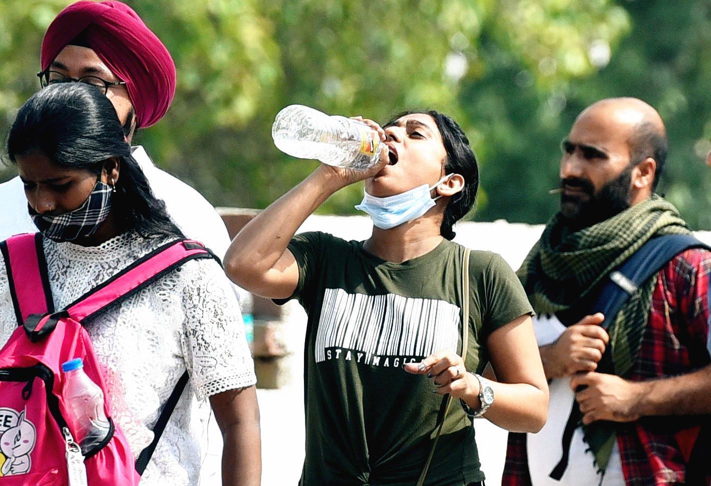 5月1日,印度新德里,当地迎来高温,行人在路上喝水。