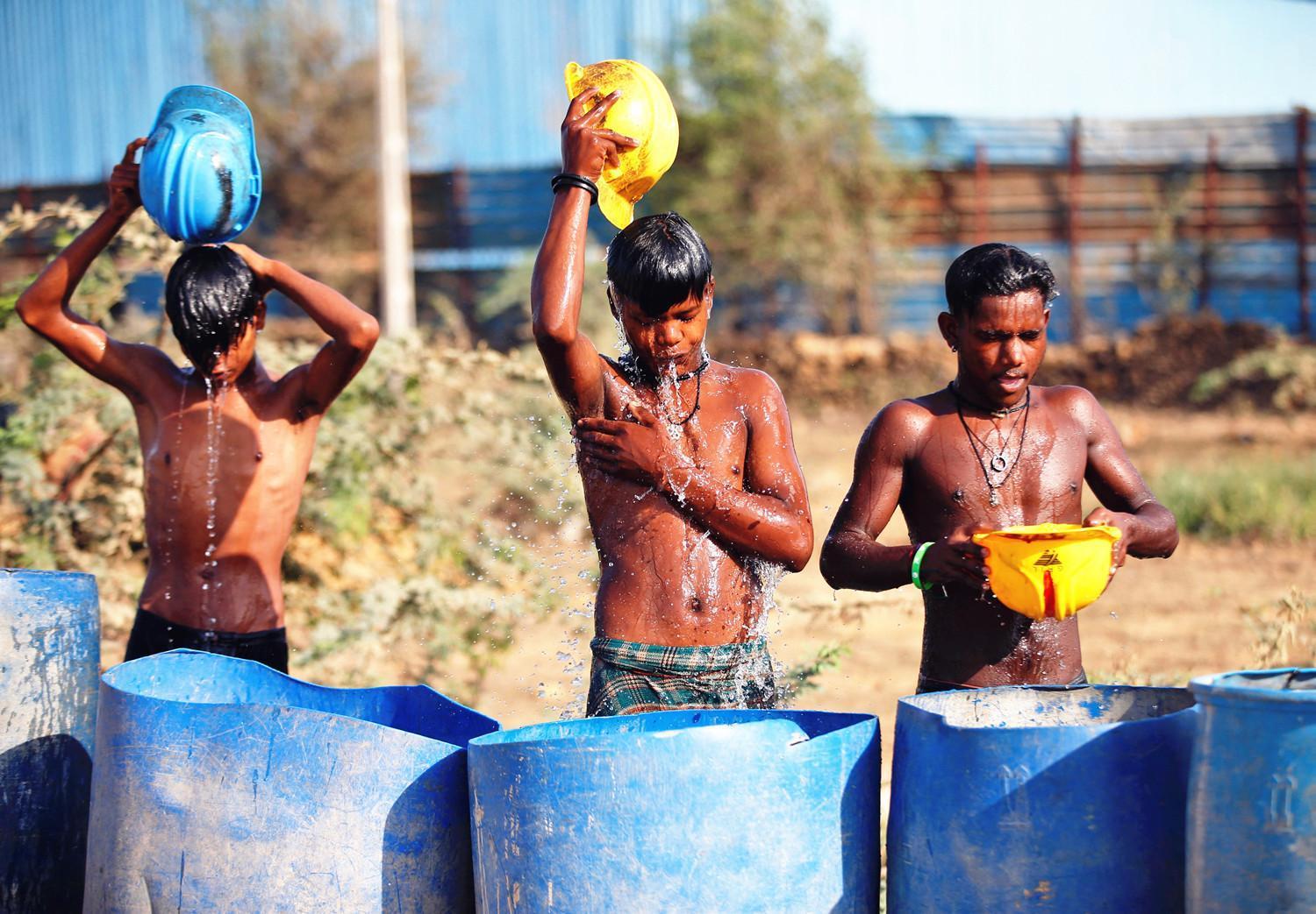4月30日,在印度艾哈迈达巴德郊外一处工地,工人用头盔舀水冲凉。