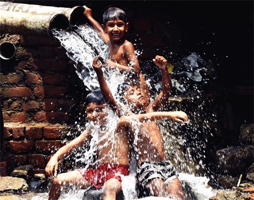 5月12日,印度新德里,极端高温天气下,一群男孩在户外戏水降温。