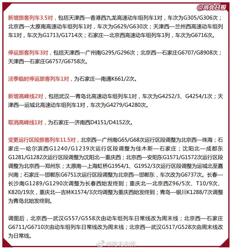 从石家庄火车站获悉,铁路部门7月10日起调整列车运行图。本次调图后,石家庄站将办理客运业务列车508列。此次调图后,石家庄将首开直达珠海的高铁,车次为G65次,开往至嘉兴的高铁,车次为G1954/1次。同时,石家庄站增加一趟去往香港西九龙的高铁G305次,这趟高铁也将在邯郸东站办理客运业务,届时邯郸市民可以直接从邯郸去往香港。(河北日报)